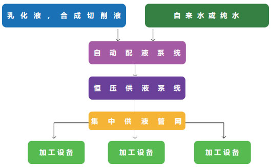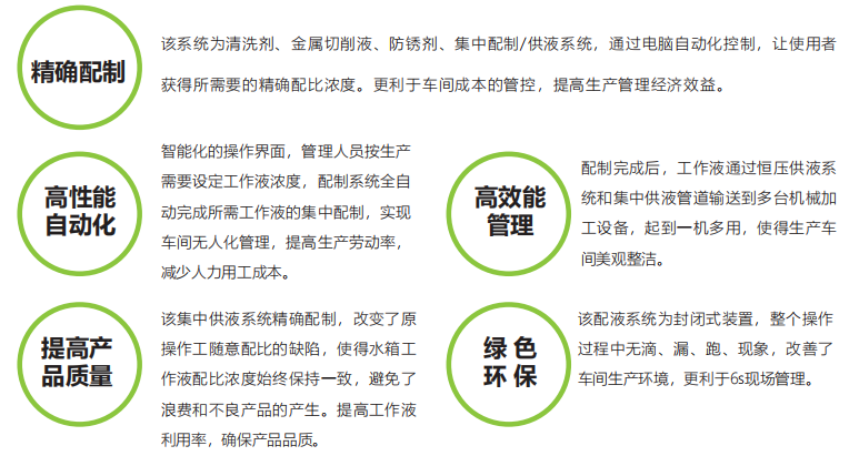 該配制/供液系統通過電腦精準控制,使工作液配比濃度始終保持一致,避免浪費和不良品的產生,解決了國內外機械加工制造企業存在的單機工作液配制繁瑣,費時費工,配比不精確的弊端。使用戶一機多用地進行數種加工液同時、準確、安全、自動化配制,具有廣泛應用的效果。